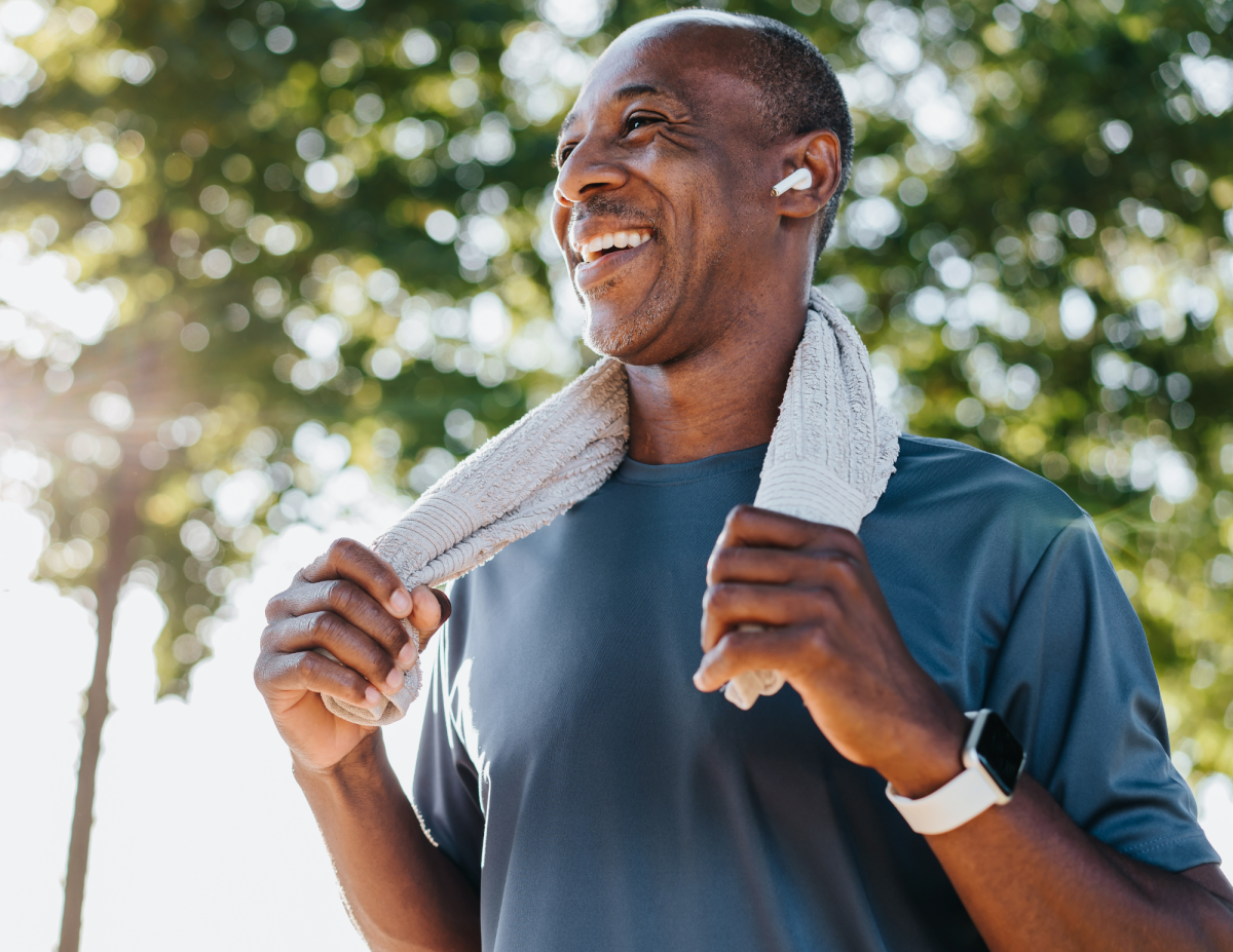 A smiling male wearing ear buds holding a towel that he is using for his workout.